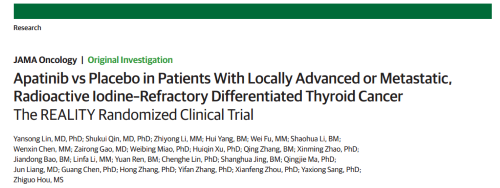 2021年12月16日,权威医学杂志《JAMA Oncology》(影响因子31.777)在线发表阿帕替尼的一项III期临床研究(REALITY)——甲磺酸阿帕替尼片治疗局部进展/转移性放射性碘难治性分化型甲状腺癌(RAIR-DTC)患者的多中心、随机、双盲、安慰剂对照临床研究。此研究由北京协和医院的林岩松教授和南京金陵医院的秦叔逵教授发起,在全国21个研究中心展开,由AG体育医药中央医学事务部团队支持完成。