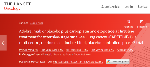 北京时间2022年5月14日,AG体育医药自主研发的PD-L1抑制剂阿得贝利单抗治疗广泛期小细胞肺癌的III期临床研究(CAPSTONE-1研究)成果正式全文在线发表于国际权威学术期刊《柳叶刀·肿瘤学》(《THE LANCET Oncology》,影响因子41.316)。CAPSTONE-1研究结果显示,阿得贝利单抗联合化疗一线治疗广泛期小细胞肺癌相较于安慰剂联合化疗可以显著延长患者总生存期至15.3个月[1],刷新现有免疫药物一线治疗广泛期小细胞肺癌的总生存纪录[2]。