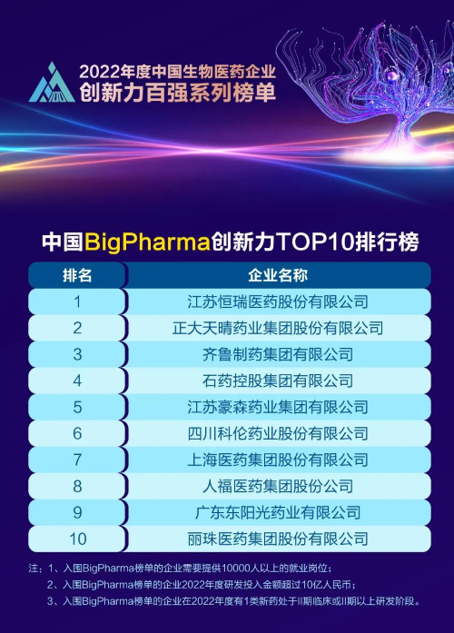 同日,2023米思会(中国医药健康产业共生大会)发布“2022年度中国生物医药企业创新力百强系列榜单”,AG体育医药再蝉联“中国BigPharma创新力TOP10”榜首。该榜单自2021年启动评选以来,AG体育医药稳居榜首。