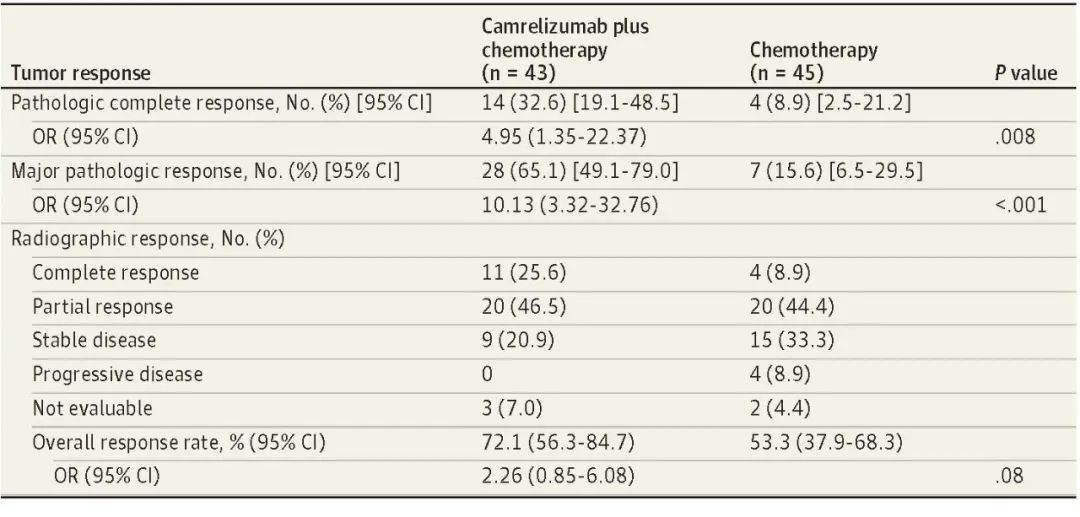 北京时间8月3日,AG体育医药创新药卡瑞利珠单抗联合化疗(Cam+CT)对比化疗(CT)新辅助治疗ⅢA/ⅢB (T3N2) 期非小细胞肺癌(NSCLC)结果在线发表于国际权威期刊JAMA Oncology[1]。该研究是由空军军医大学唐都医院姜涛教授、雷杰教授团队联合陕西省肿瘤医院雷光焰教授团队、兰州大学第二附属医院王成教授团队共同参与的一项随机对照、多中心、Ⅱ期临床研究(TD-FOREKNOW,NCT04338620)。研究结果显示,与化疗相比,卡瑞利珠单抗联合化疗新辅助治疗NSCLC显著提高了病理完全缓解(pCR)率(32.6% vs 8.9%,OR=4.95,95% CI :1.35-22.37, P =0 .008),且安全性良好。本研究是卡瑞利珠单抗新辅助治疗可切除NSCLC患者的首个随机对照研究,为NSCLC新辅助免疫治疗再添新证。