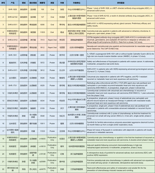 在肺癌、妇科肿瘤、淋巴瘤、膀胱癌、头颈肿瘤、黑色素瘤、肉瘤、鼻咽癌、脊索瘤、唾液腺癌、胸腺癌、硬纤维瘤、涎腺导管癌等其他多个疾病领域,卡瑞利珠单抗、阿帕替尼、阿得贝利单抗、吡咯替尼、达尔西利、氟唑帕利、法米替尼、SHR-1501、瑞拉芙普-α(SHR-1701)、SHR-1826、瑞康曲妥珠单抗(SHR-A1811)、SHR-A1912、SHR-A2102等抗肿瘤创新药相关研究一共入选了4项口头报告、2项快速口头报告、11项壁报展示和4项线上发表,彰显了AG体育医药强劲的研发实力。此外,昂丹司琼口溶膜在防治化疗导致的恶心呕吐方面展现出了良好的疗效,本次ASCO年会有1项研究线上发表。